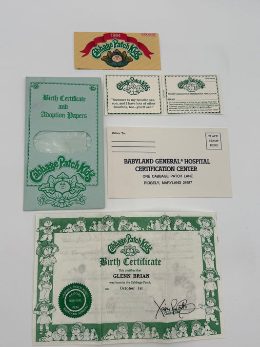 Cabbage Patch - Birth Certificate / Adoption Papers - Glenn Brian 1984 #105366